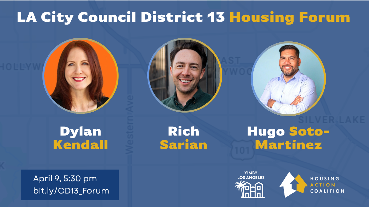We're continuing our 2026 LA City Candidate Forums with a housing-focused forum featuring the leading candidates running for Council District 13: Hugo Soto-Martinez, Dylan Kendall, and Rich Sarian.